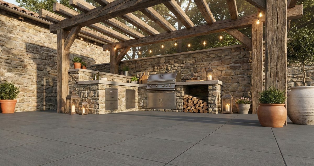 Khu BBQ ngoài trời là không gian thư giãn của gia đình, nhưng cũng là khu vực chịu tác động khắc nghiệt nhất của môi trường: nắng, mưa, độ ẩm, dầu mỡ và tần suất đi lại cao. Đây là nơi mà vật liệu lát sàn phải đáp ứng tiêu chuẩn cao hơn nhiều so với khu vực nội thất.