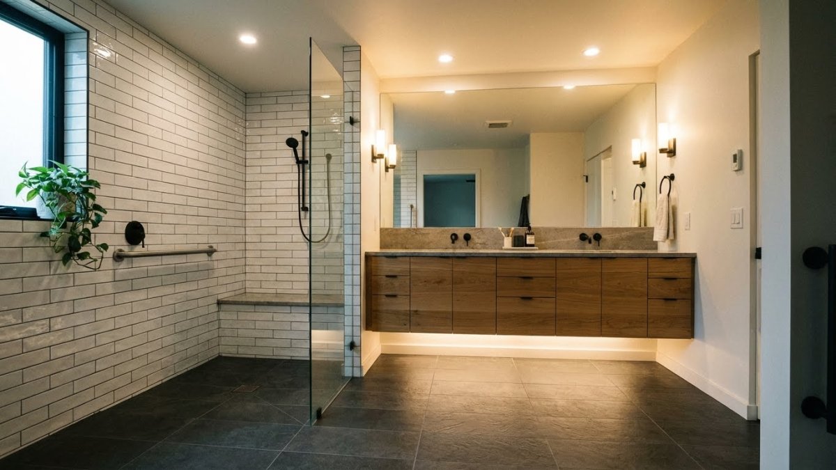Lát nền: Tuyệt đối tránh gạch men bóng. Hãy chọn gạch có bề mặt nhám, sần (Rustic) hoặc men khô với hệ số chống trơn từ R10 trở lên. Kích thước gạch nên nhỏ (30x30, 30x60) để tăng đường ron, giúp thoát nước và tăng ma sát.