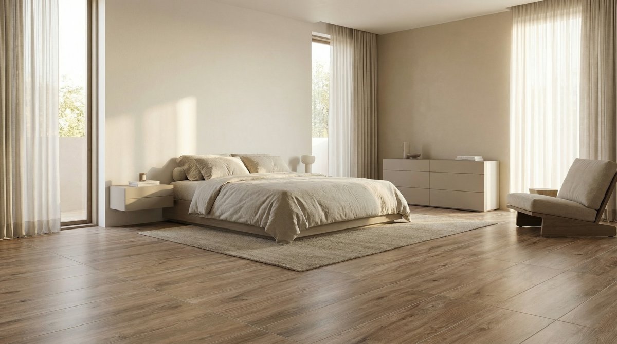 Đây là không gian riêng tư, cần sự thoải mái. Gạch vân gỗ (thanh dài) là lựa chọn hàng đầu vì mang lại cảm giác ấm áp như gỗ tự nhiên nhưng bền bỉ hơn và không lo mối mọt.