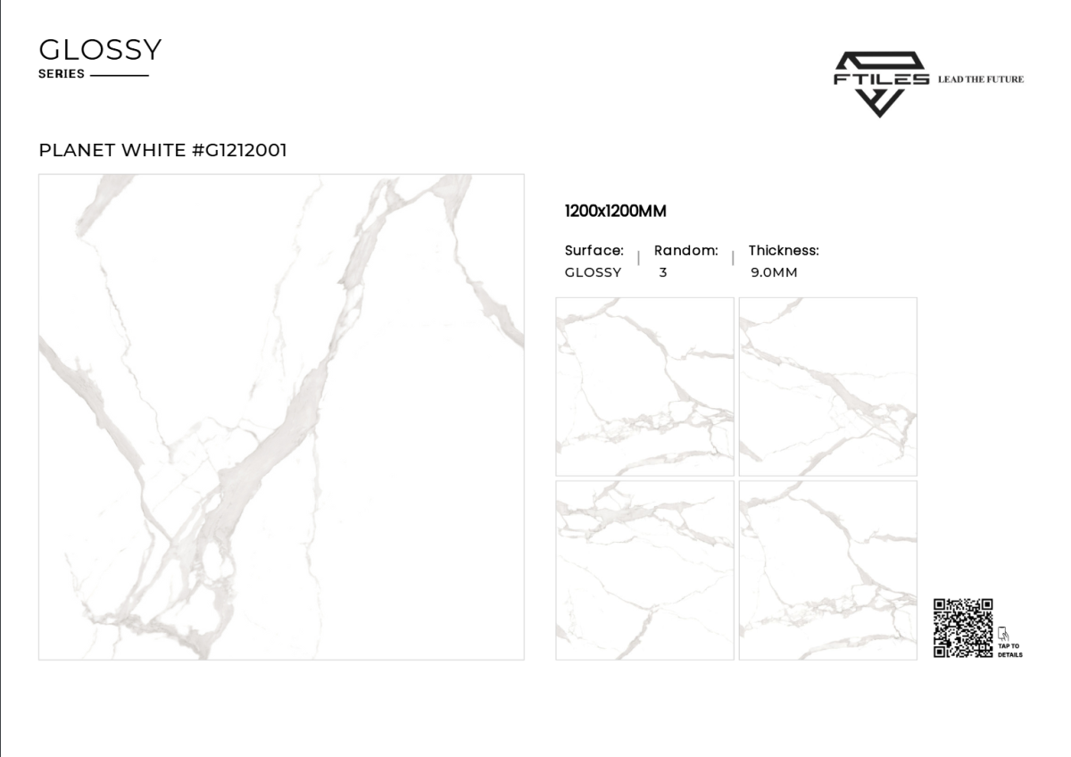 PLANET WHITE – G1212001 thuộc bộ sưu tập 1200x1200mm Glossy PGVT cao cấp của FTILES. Đây là mẫu gạch khổ lớn với gam trắng sáng tinh khiết, kết hợp vân marble mềm mại trên nền bóng kính cao cấp, mang lại không gian sang trọng – thoáng rộng – tinh tế.