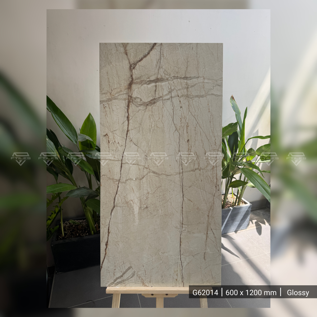 AVORIO – G62014 thuộc bộ sưu tập Glossy PGVT cao cấp của FTILES, kích thước 600x1200mm. Gạch nổi bật với gam xám hiện đại, vân marble nhẹ nhàng và bề mặt bóng kính sang trọng, giúp không gian thêm rộng thoáng, sáng và tinh tế.