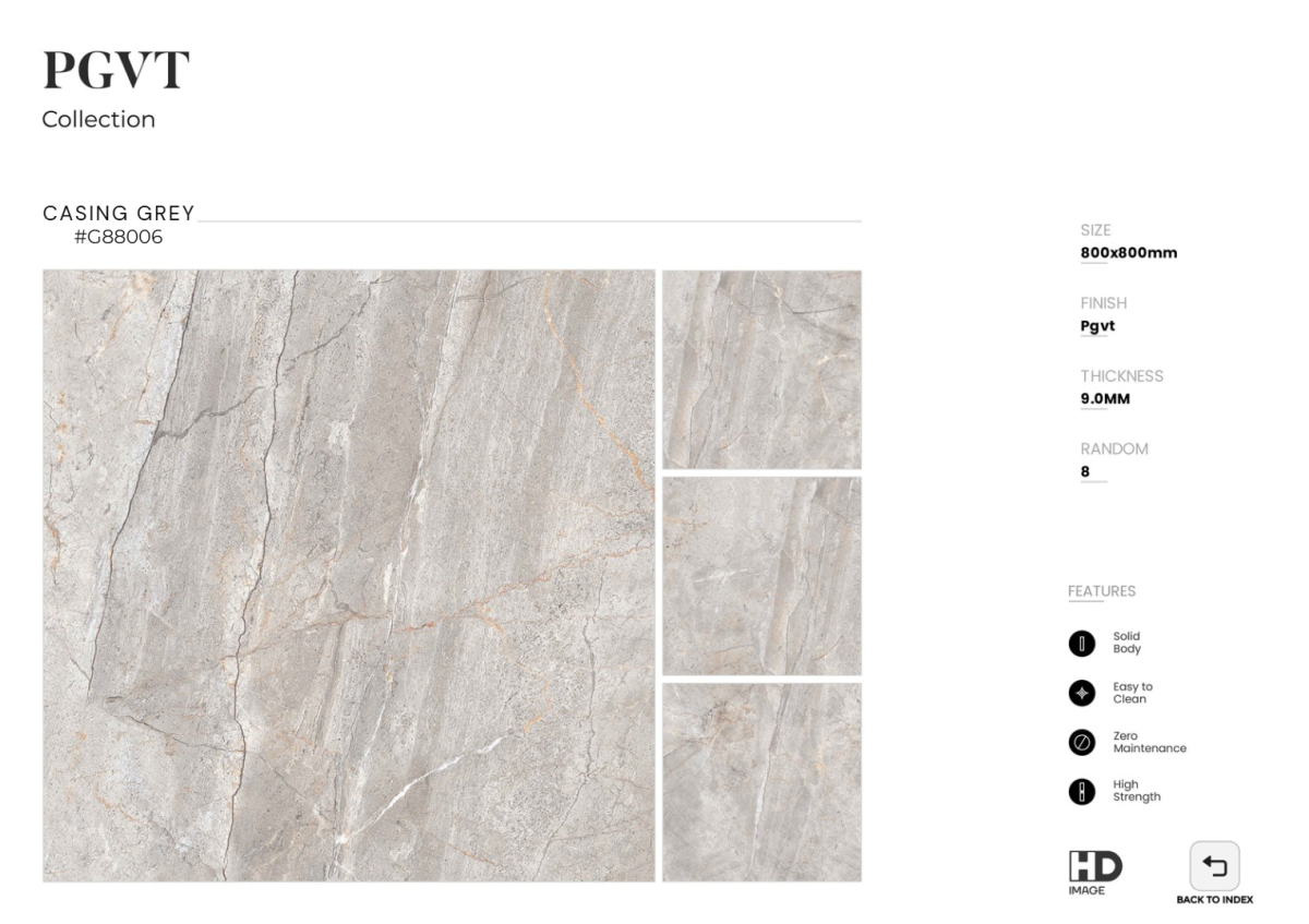 CASING GREY – G88006 là dòng gạch PGVT (Polished Glazed Vitrified Tile) cao cấp với kích thước 800x800mm, bề mặt bóng kính sang trọng. Với tông màu xám marble trung tính, vân đá tự nhiên mềm mại và sắc nét, sản phẩm mang đến sự hiện đại – thanh lịch – bền vững cho không gian sống và làm việc.