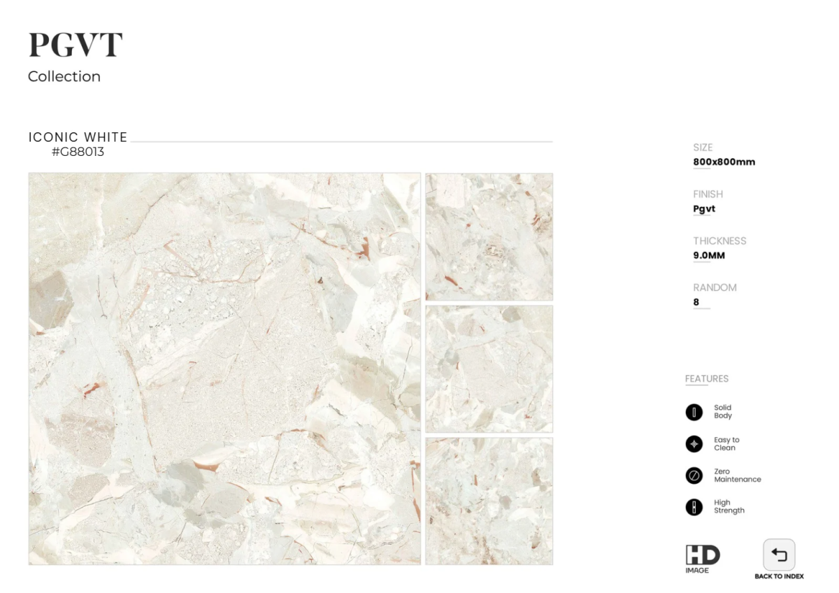 ICONIC WHITE – G88013 là mẫu gạch PGVT (Polished Glazed Vitrified Tile) cao cấp, nổi bật với gam trắng tinh khôi cùng hiệu ứng vân đá marble nhẹ nhàng. Với kích thước 800x800mm và bề mặt bóng kính sang trọng, sản phẩm mang đến cảm giác thanh lịch – tinh tế – đẳng cấp, phù hợp cho cả công trình dân dụng và thương mại cao cấp.