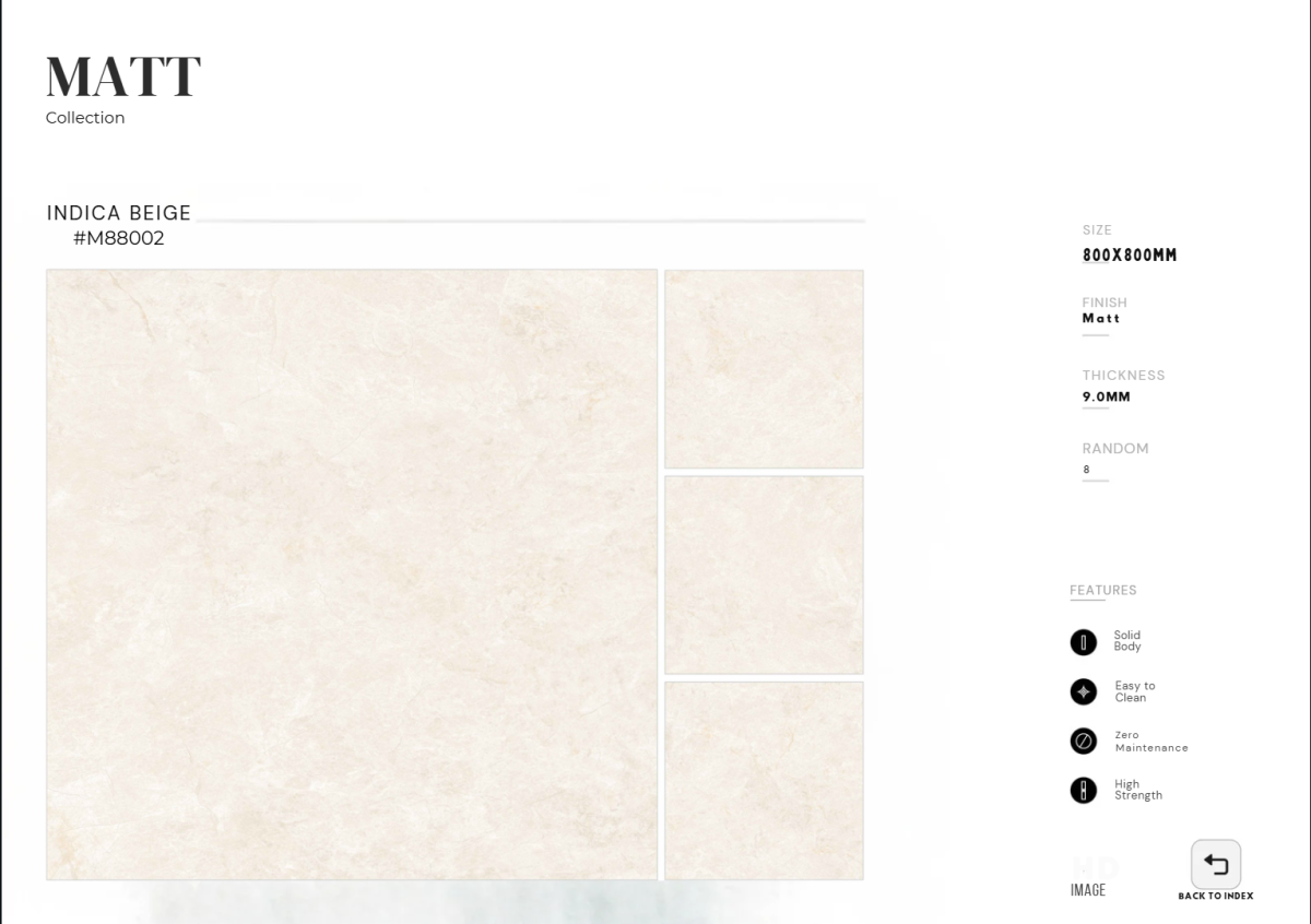 INDICA BEIGE – M88002 không chỉ là vật liệu lát sàn, mà còn là giải pháp hoàn thiện không gian với sự cân bằng giữa thẩm mỹ – công năng – an toàn. Với gam màu be marble tự nhiên, bề mặt Matt chống trơn và độ bền vượt trội, sản phẩm mang đến sự ấm áp – tinh tế – hiện đại, phù hợp cho các công trình dân dụng và thương mại cao cấp.