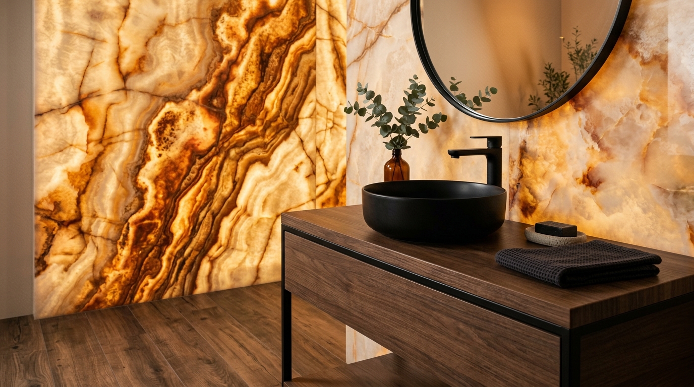 Vân đá tự nhiên: Các dòng gạch Porcelain của FTILES tái hiện hoàn hảo những đường vân sắc nét của đá Marble, Travertine hay Limestone. Đặc biệt, dòng gạch xuyên sáng (Onyx) tạo chiều sâu hút mắt, mang đến vẻ sang trọng khó cưỡng.