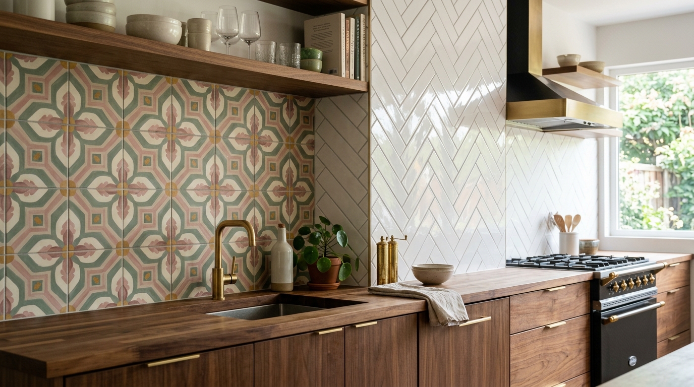 Gạch bông & Hình khối: Những họa tiết đối xứng trên gạch lục giác hoặc gạch thẻ xếp xương cá của FTILES tạo điểm nhấn nghệ thuật độc bản cho khu vực bếp hay phòng tắm.