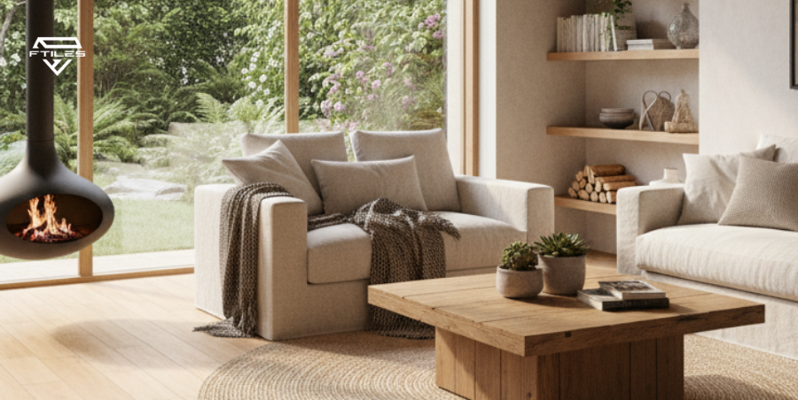 Gạch lát nền vân gỗ tạo nên sự ấm cúng và thân thiện, đặc biệt phù hợp với không gian phòng khách kiểu hiện đại, cổ điển hoặc tân cổ điển.