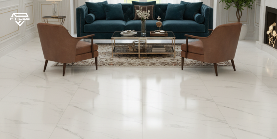Gạch bóng kính vân đá trắng 800×800mm: Kinh điển cho nhà phố, căn hộ chung cư.