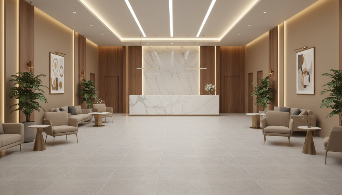 Xu hướng kiến trúc hiện đại ưu tiên sự liền mạch. Gạch porcelain khổ lớn của FTILES đáp ứng hoàn hảo yêu cầu này, giảm thiểu đường ron và tạo cảm giác không gian mở rộng, sang trọng hơn. Các kích thước lớn giúp kiến trúc sư dễ dàng tạo điểm nhấn ấn tượng cho sảnh, mặt tiền và khu vực lát nền cao cấp.