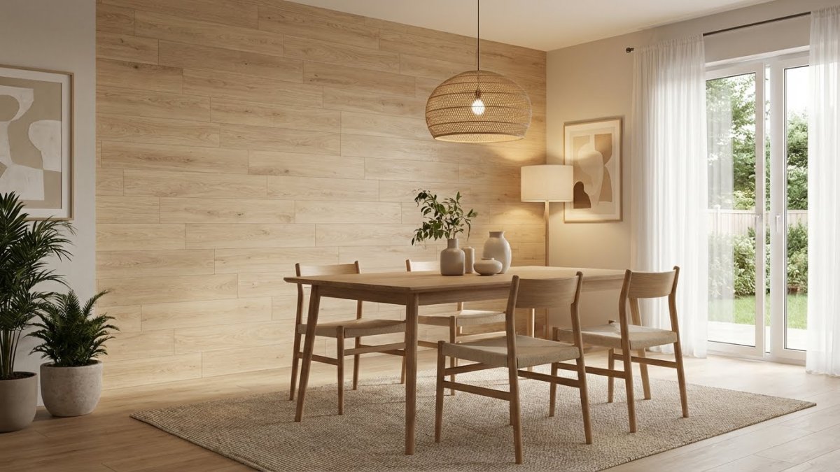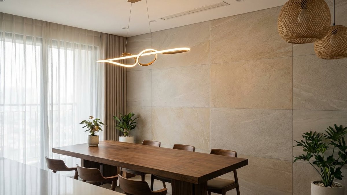 Ví dụ: Gạch ốp màu be + bàn ăn gỗ nâu nhạt + đèn thả đen mờ → hiện đại, ấm và rất dễ ứng dụng.