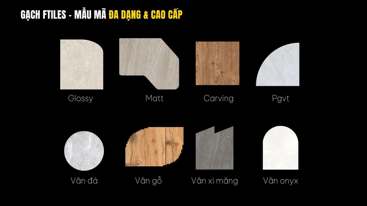 Đa dạng bề mặt: bóng kính (PGVT), mờ (Matt), carving 3D, baby skin chống trượt.