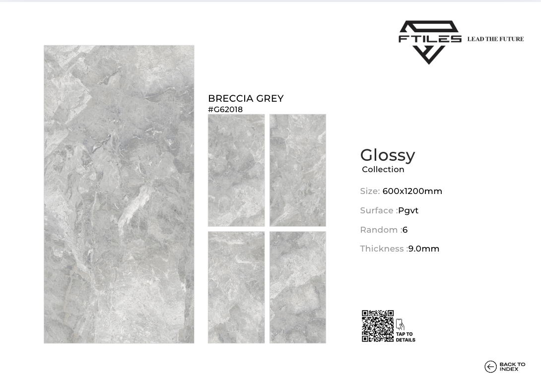 Với gam xám marble hiện đại và bề mặt bóng kính, BRECCIA GREY G62018 lý tưởng cho: