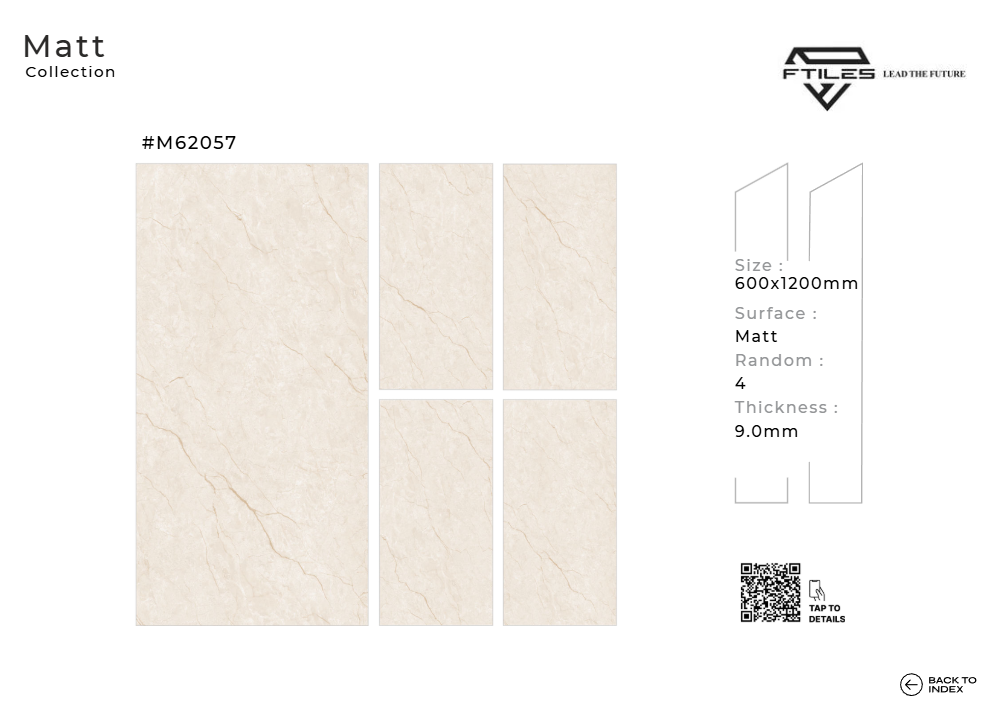 MICHIE BEIGE – M62057 không chỉ là gạch lát/ốp, mà còn là giải pháp kiến tạo không gian sang trọng & đẳng cấp. Với gam beige trang nhã, vân marble tự nhiên tinh tế, bề mặt PGVT bóng kính và độ bền vượt trội, sản phẩm mang lại sự cân bằng hoàn hảo giữa thẩm mỹ – công năng – đẳng cấp, lý tưởng cho công trình dân dụng và thương mại cao cấp.
