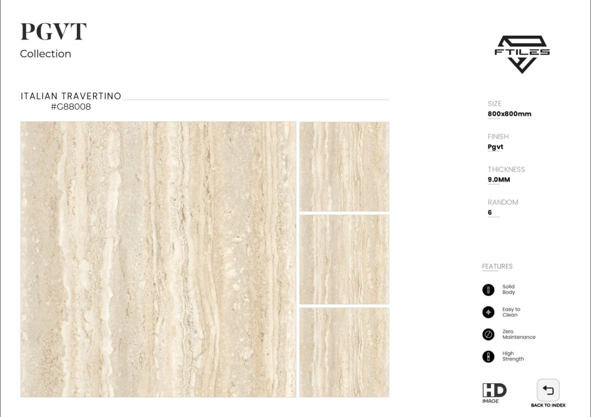 ITALIAN TRAVERTINO – G88008 không chỉ là gạch lát sàn, mà còn là giải pháp kiến tạo không gian sống và làm việc mang đậm dấu ấn Ý. Với màu be travertine thanh lịch, vân đá tự nhiên tinh xảo, bề mặt PGVT bóng kính sang trọng và độ bền vượt trội, sản phẩm mang lại sự cân bằng hoàn hảo giữa thẩm mỹ – công năng – độ bền, khẳng định phong cách sống sang trọng & tinh tế.