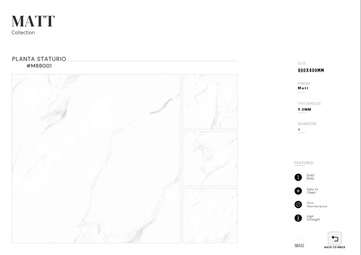 PLANTA STATURIO – M88001 không chỉ là gạch lát sàn, mà còn là giải pháp hoàn thiện không gian theo phong cách hiện đại – tối giản – tinh tế. Với nền trắng marble thanh lịch, vân đá Statuario độc đáo, bề mặt Matt chống trơn và độ bền vượt trội, sản phẩm mang lại sự cân bằng giữa thẩm mỹ – công năng – an toàn, lý tưởng cho cả công trình dân dụng và thương mại cao cấp.